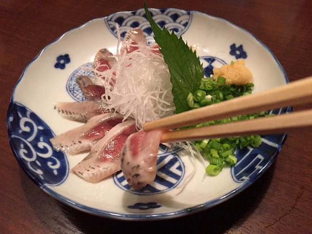 続いて皮むきです。背びれのつけ根の硬い部分に包丁で切れ目を入れると、皮が剥きやすくなります。切り込みに親指を入れて、皮を剥ぎ取ります。後は、適当な大きさにカットすれば、イワシの刺身が完成します。